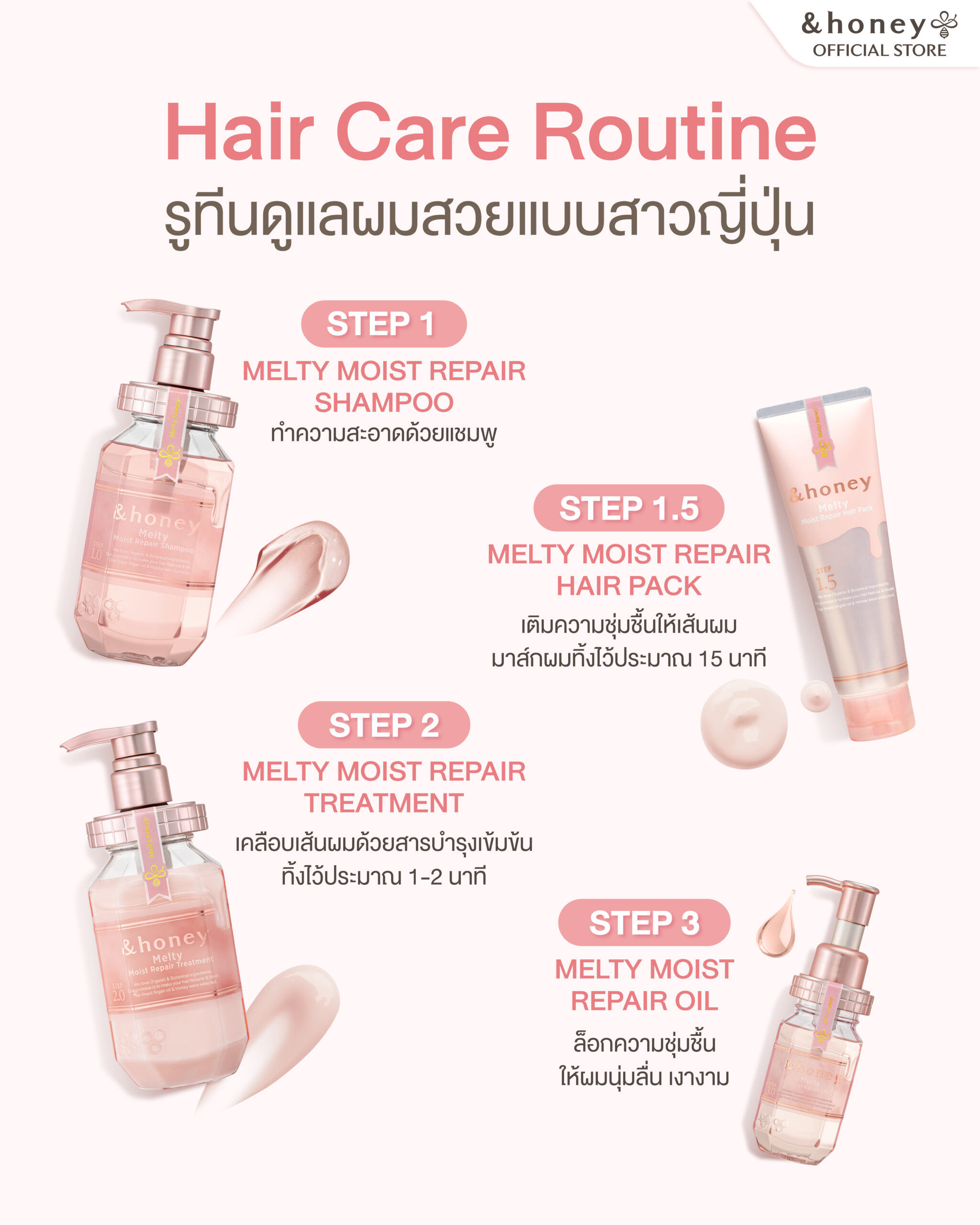 Hair Care Routine แค่เปลี่ยนรูทีน ก็เปลี่ยนผมเสียให้กลายเป็นผมสวยได้ เพียงแค่ใช้ &honey Melty Moist Repair ครบ 4 สเต็ป ใช้ทั้งเซ็ต = เหมือนเปลี่ยนผมใหม่! แค่ 4 สเต็ปง่าย ๆ ผมก็สวยนุ่ม ลื่น ได้เหมือนเพิ่งออกจากซาลอนทุกวัน