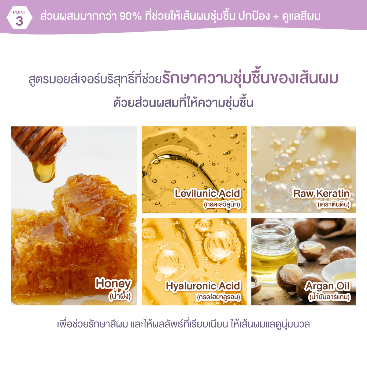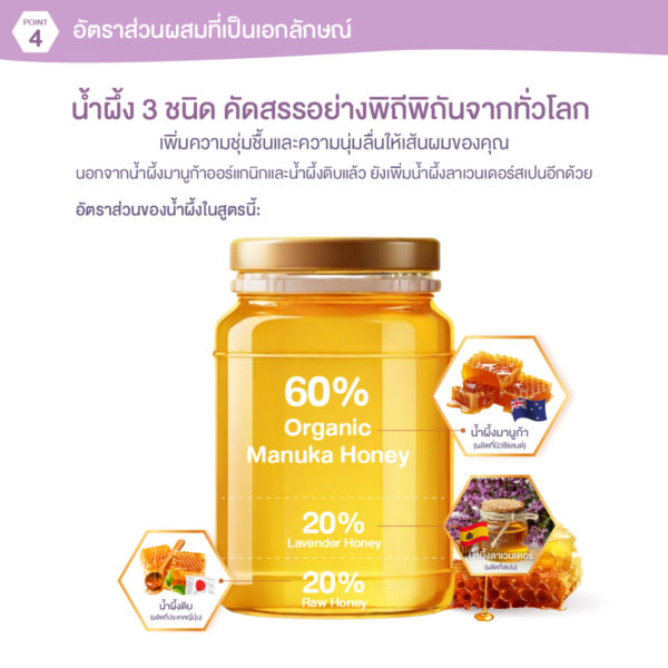– 60% น้ำผึ้งมานูก้าออร์แกนิก (จากนิวซีแลนด์): ช่วยล็อคความชุ่มชื้นให้เส้นผมเงางาม