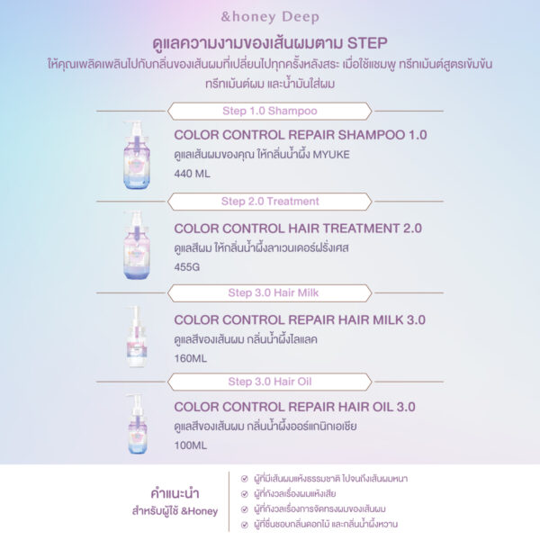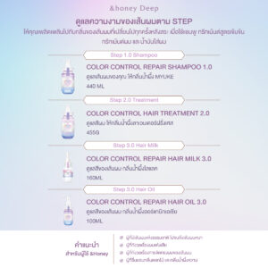 แชมพูเน้นดูแลสีผมที่ผสานคุณค่าจากน้ำผึ้งรักษาสีผมให้สวยงามและติดทนนานเป็นพิเศษ ผมเงางาม เรียบลื่น ลดปัญหาเรื่องสีผมซีดจาง และช่วยกักเก็บความชุ่มชื้น จัดทรงง่าย ให้กลิ่นหอมหวานละมุนของน้ำผึ้งที่ผสานเข้ากับดอกลิลลี่ สูตรเฉพาะช่วยล็อคสีผม ให้สดใสยาวนาน